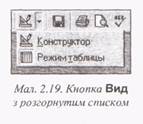 2. Відкривання таблиці на вкладці Таблицы за допомогою миші за замовчуванням відображає її в режимі таблиці. Цього самого результату можна досягти і за допомогою кнопки Для зміни режиму відображення таблиці (перебуваючи в одному режимі, перейти до іншого) треба скористатися кнопкою Вид панелі інструментів вікна програми (мал. 19) (ця кнопка змінює свою піктограму при переході з режиму в режим)