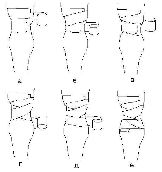 Бинты Приседать надо всегда в бинтах. Обматывайте колени бинтами независимо от того, разминочные это подходы или рабочие. Это простое правило сбережет ваши колени. Бинты могут быть или специальные для пауэрлифтинга, или обычные эластичные, купленные в аптеке. Длина каждого бинта, не должна превышать 2 метров. Бинты надо натягивать туго. Для этого полностью распрямите ногу, как только возможно, носок натяните к себе, пятку от себя. Если Вы замотаете согнутую ногу, не будет необходимой плотности. Обматывайте так: сначала обмотайте место над коленом, и медленно, опускаясь вниз «елочкой», обмотайте колено. Под коленом тоже нужно сделать один круг и закрепить бинт (рис. 3.8).