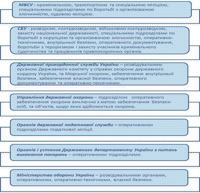 Підрозділи ОРД – це спеціальні оперативні підрозділи, які входять до складу правоохоронних органів, яким згідно статті 5 ЗУ “Про ОРД” надано право здійснювати оперативно-розшукову діяльність. В Законі України " Про державний захист працівників суду та правоохоронних органів" приведено вичерпний перелік правоохоронних органів, до яких, зокрема, належать: органи прокуратури;
