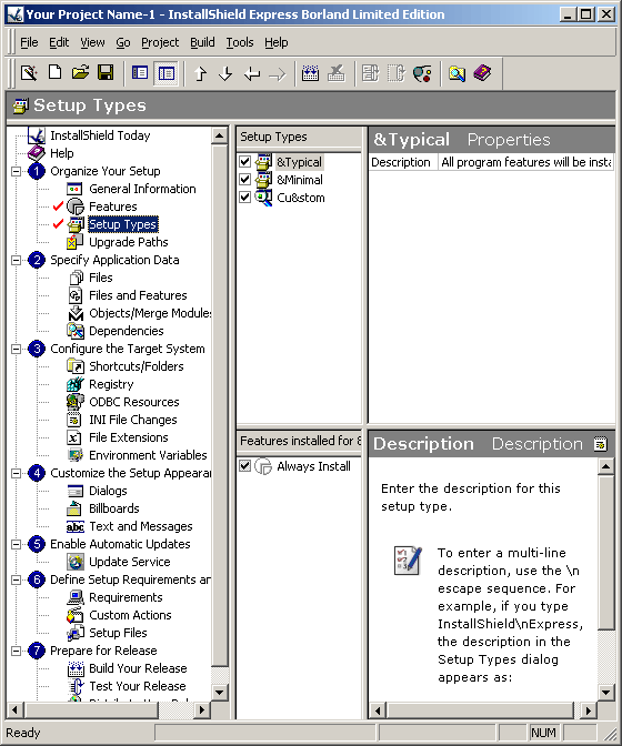 4-ші сурет. Features группасындағ ы бірнеше элементтерорнатудың кө п нұ сқ аулы болуын қ амтамасыз етеді Setup Types командасы программаны орнату кезінде қ олданушығ а орнатудың нұ сқ асын таң дауғ а мү мкіндік береді. Орнату ә деттегідей(Typical), минималды (Minimal) немесе таң даулы (Custom) болады. Егер орнататын программа қ иын болса, бірнеше компоненттен тұ рса, бұ л мү мкіндік ә детте бө лінеді. Для программы Сапер 2002 предполагается только один вариант установки — Typical. Поэтому флажки Minimal и Custom нужно сбросить (рис. 18.5). Airport программасы ү шін тек бір орнату нұ сқ асы болжанады – Typical. Сондық тан қ алғ ан флажоктарды алып тастаймыз (5-ші сурет).