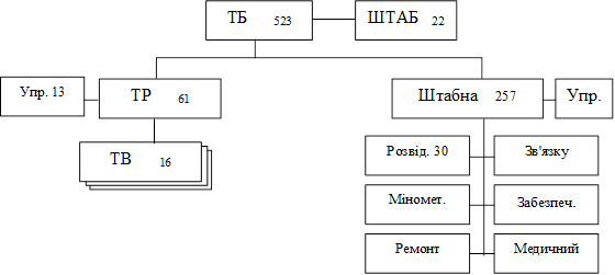 - водій; - радіотелефоніст-писар; - сержант – спеціаліст технічної служби. Всього в танковій роті: Особового складу – 61 чол.; Танків М-1 “Абрамс” – 14 од.; Радіостанції – 16 од., Автомобілів – 16 од. Штабна рота складається з: - розвідувального взводу (о/с – 30 чол., БРМ – 6 од.); - мінометного взводу (о/с – 36 чол., 106, 7 мм СМ – 6 од.); - взводу зв’язку (о/с – 11 чол., БТР – 1 од., автомобіль – 7 од.); - взвод забезпечення (о/с – 57 чол., КШМ – 1 од.); - ремонтного взводу (о/с – 83 чол., БТР – 4 од.); - медичного взводу (о/с – 34 чол., БТР – 6 од., автомобіль – 13 од.); - управління роти (о/с – 6 чол., КШМ – 2 од.). Всього в штабній роті: Особового складу – 257 чол.; БРМ М-3 “Бредлі” – 6 од.; 106, 7 мм СМ – 6 од.; БТР М113 А2 – 11 – од.; КШМ М577А1 – 5 од.; Радіостанції – 96 од.; Автомобілів – 85 од. Штаб батальйону складається з: Начальника штабу. Розвідувальної секції Оперативної секції. Секції особового складу. Секції матеріально-технічного забезпечення. Всього в штабі танкового батальйону: Особового складу – 22 чол.; Танків – 2 од.; КШМ М577А1 – 3 од.; Радіостанції – 11 од. Всього у танковому батальйоні: о/с – 523 танк М – 1 “Абрамс” – 58 од.; БРМ М – 3 “Брєдлі” – 6 од.; 106, 7 мм СМ – 6 од.;