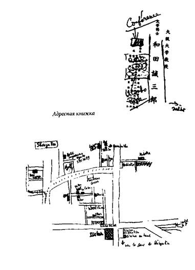 Существуют способы возмещения этой анонимности (по крайней мере, нам так это представляется), и совмещение этих способов составляет систему. Можно представить адрес при помощи ориентирующей схемы (нарисованной или напечатанной), своего рода географической справки, где дом размещается относительно уже известной метки, например вокзала (жители города большие мастера в создании этих импровизированных рисунков, где прорисовываются улица, здание, канал, железная дорога, вывеска, — рисунки, которые превращают обмен адресами в приятное общение, в котором жизнь тела и искусство графического жеста вновь занимают свое место: всегда смотришь с упоением, как кто-то пишет, точнее, рисует; всякий раз, когда мне подобным образом сообщали адрес, мое внимание захватывал тот жест собеседника, когда он, перевернув карандаш, начинал стирать резинкой слишком размашистую линию какого-нибудь проспекта или перекрестья виадука; несмотря на то, что ластик чужд японской графической традиции, от его действия исходило нечто умиротворяющее, ласкающее и надежное, как если бы даже в самом этом незначительном действии тело «трудилось с большей выдержкой, нежели дух», в согласии с заповедью актера Дзеами; процесс изготовления адреса был гораздо важнее самого адреса, и, зачарованный этим зрелищем, я бы часами смотрел, как мне его дают). Можно также, если только знаешь место, ку-