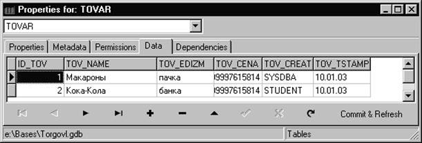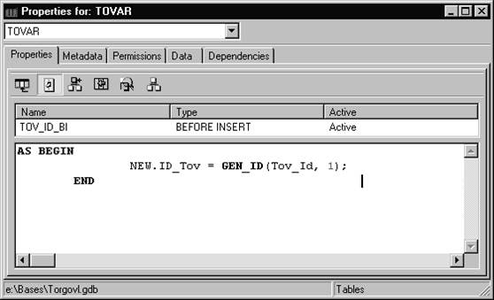 Рис.19 Результат заполнения таблиц БД После этого ввод данных из консоли не получается, но при помощи операторов - все замечательно. В таблице фиксируется кто и когда добавлял в нее записи. Создаем новый Первичный ключ по полю Id_Tov: ALTER TABLE TOVAR ADD CONSTRAINT Tov_PK PRIMARY KEY (Id_Tov) Создаем новый альтернативный ключ по полям Tov_NAME, TOV_EDIZM: ALTER TABLE TOVAR ADD CONSTRAINT Tov_UK UNIQUE (Tov_NAME, TOV_EDIZM) Создание автоинкрементных полей. Генераторы. Создадим “Автоинкрементное поле” на основе поля Id_Tov типа INTEGER и Генератора. Его создание позволяет автоматически задавать уникальные значения полям создаваемых записей. Создаем генератор: CREATE GENERATOR TOV_GEN Задаем его начальное значение: SET GENERATOR TOV_GEN TO 2 Для того, чтобы он “заработал” нужно создать триггер SET TERM!!; CREATE TRIGGER Tov_ID_BI FOR TOVAR BEFORE INSERT AS BEGIN NEW.ID_Tov = GEN_ID(Tov_GEN, 1); END !! SET TERM;!! Выполнив этот SQL-скрипт, посмотрите - на закладке Свойства для таблицы TOVAR назначен триггер, срабатывающий перед вставкой новых записей (рисунок 20).