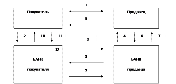 1-заключение договора о поставке товара 2-покупатель дает поручение своему банку на открытие аккредитива 3-авизирование (уведомление) банка-продавца об открытии аккредитива 4-авизирование продавца об открытии аккредитива 5-поставка товара 6-от продавца к банку передача отгрузочных документов 7-предоставление кредита продавцу 8-пересылка документов из банка продавца к банку покупателя 9-платеж по документам 10-передача документов покупателю 11-акцепт документов 12-снятие денег под аккредитив со счета покупателя