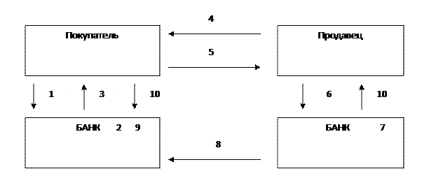 1-покупатель предоставляет в свой банк заявление на получение чеков и платежное поручение на депонирование сумм на своем счете. 2-в банке покупателя бронируются средства на отдельном счете и заполняются чеки. 3-банк выдает покупателю чековую книжку с чеками. 4-продавец предъявляет покупателю документы на отгруженную продукцию. 5-покупатель выдает чек продавцу. 6-продавец предъявляет чек в свой банк. 7-в банке продавца зачисляются денежные средства на счет продавца. 8-банк продавца предъявляет чек для оплаты банку покупателя 9-банк покупателя списывает сумму чеков за счет ранее забронированных сумм. 10-выдаются выписки клиентам с расчетного счета.