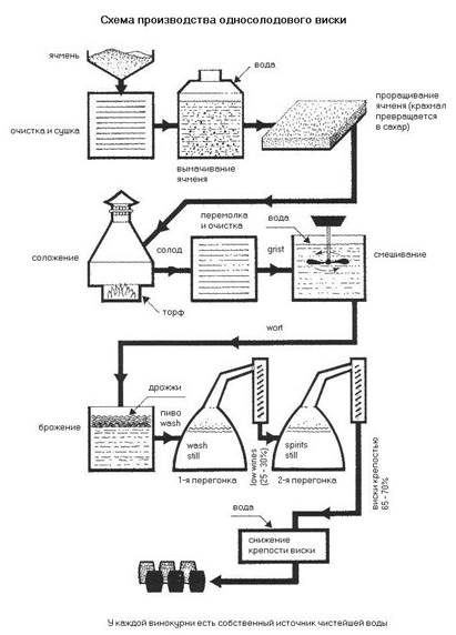 Брожение Это процесс превращения сахара в спирт под воздействием дрожжей. Луи Пастер говорил: " Брожение есть жизнь без воздуха, без свободного кислорода". Общий баланс процесса в упрощенном виде выглядит следующим образом: САХАР = ЭТИЛОВЫЙ СПИРТ + УГЛЕКИСЛЫЙ ГАЗ Дрожжи, служащие катализатором брожения, могут быть как естественного происхождения (на кожуре плодов), так и специально добавляться в сусло. Этот процесс всегда сопровождается повышением температуры. Таким образом, контролируя температуру, можно контролировать время брожения. Требуется 17 граммов сахара на литр сусла, чтобы повысить содержание этилового спирта в бражке на 1%. Путем брожения получается спиртное крепостью максимум 16%, поскольку большее количество алкоголя нейтрализует дрожжи. Здесь следует отметить, что содержание спирта в напитке, называемое крепостью, выражается, в большинстве случаев, в объемных процентах безводного спирта, отвечающих плотности напитка при температуре +20°С. Дистилляция (перегонка) Дистилляция - это процесс отделения жидкости с высоким содержанием спирта от перебродившего сусла путем испарения с последующей конденсацией образовавшихся паров. Процесс перегонки чрезвычайно прост: температура кипения чистого спирта - +78, 4°С, воды -+100°С. В промежутке между этими двумя температурами спирт испаряется гораздо быстрее, чем вода. Если его охладить, то он конденсируется. Напиток можно перегонять несколько раз подряд для повышения его крепости. Таким образом получаются все крепкие спиртные напитки. Существует несколько видов дистилляции. Двойной дистилляции подвергаются коньяки, некоторые арманьяки, иногда ром и текила. При этом напиток дважды перегоняется в том же самом перегонном аппарате. В этом случае используется перегонный аппарат, называемый " alambic charentais" (аламбик шарантэ). При производстве односолодового виски мы встречаем аппарат " pot still" (пот стил), и здесь двойная перегонка проводится последовательно в двух аппаратах, при этом продукт первой перегонки перетекает во второй аппарат. Наконец, для получения остальных крепких спиртных напитков обычно используется постоянная дистилляция, протекающая в перегонном аппарате, называющемся " patent still" (патент стил) или " coffey still" (кофей стил). Первыми людьми, начавшими в примитивной форме использовать процесс дистилляции, были, по всей видимости, китайцы. Впоследствии это умение перешло к грекам. Именно от греческого слова ambix (ваза), которое арабы переделали на al ambix, произошло французское слово alambic (перегонный куб). Кстати, слово " алкоголь" было также заимствовано из арабского языка, где оно звучало как " alkhul" от китайского слова " khol". В нашей эре технику дистилляции совершенствовали в основном врачи и монахи. Интересен тот факт, что только монахи могли изучать секреты приготовления спиртных напитков, не рискуя быть отправленными на костер. Именно им мы должны быть благодарны за создание множества прекрасных ликеров, которые сегодня придают великолепный вкус различным коктейлям. А повсеместным распространением культуры потребления спиртных напитков мы обязаны голландцам, которые первыми организовали активную торговлю. Обо всем этом более подробно будет рассказано в следующих главах книги.