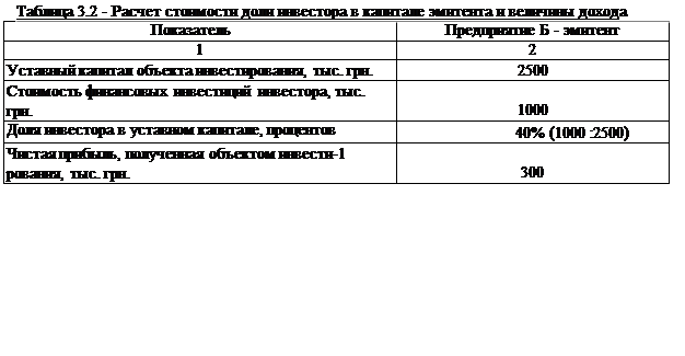 Пример 3. Предприятие А (инвестор) является одним из учредителей предприятия Б (эмитента). Взнос инвестора в уставный капитал эмитента 1000 тыс. грн., что составило долю в уставном капитале эмитента 40 %. Эта инвестиция на дату баланса у инвестора оценивается по методу участия в капитале. Определим изменение стоимости доли инвестора в капитале и величину дохода, при условии, что эмитент получил за отчетный период прибыль (таблица 3.2).