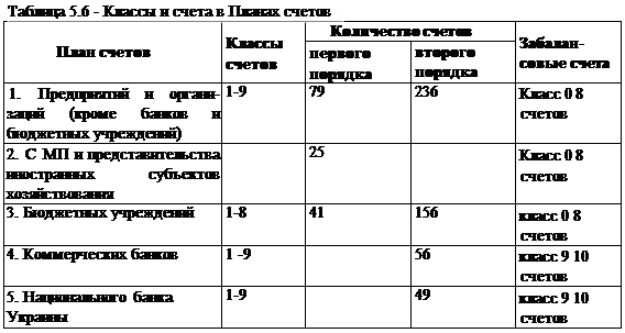 План счетов - это систематизированный перечень счетов, определяющий методологию, организацию, ведение бухгалтерского учета и составление финансовой отчетности в Украине. В Украине План счетов бухгалтерского учета являете» нормативно-правовым актом, который утверждается государственным органом (МФУ). Он позволяет практически реализовать методологические принципы формирования в бухгалтерское учете информации, необходимой пользователям. Все применяемые в Украине Планы счетов приведены в таблице 5.5.