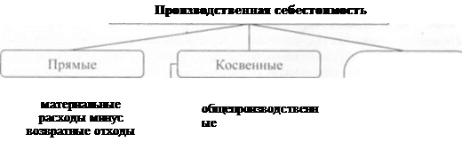 3. По способам отнесения на себестоимость продукции (работ, услуг): — прямые; - косвенные. Прямые расходы - это затраты, которые могут быть непосредственно включены в себестоимость отдельных видов продукции (работ, услуг). Прямыми расходами на производство продукции являются: стоимость сырья и основных материалов, образующих основу производимой продукции; стоимость покупных полуфабрикатов и комплектующих изделий: заработная плата, выплачиваемая рабочим; отчисления на социальные мероприятия; амортизация средств труда; потери от брака и другие. Прямые расходы полностью включаются в себестоимость производства. Косвенные расходы - это затраты, непосредственно не связанные с производством продукции (работами, услугами), например, расходы по управлению и обслуживанию процесса производства. К ним относятся: - расходы на управление производством (оплата труда аппарата управления цехами, участками; начисления на социальные мероприятия аппарата управления цехами, участками; расходы на служебные командировки персонала цехов, участков и другие); - амортизация основных средств общепроизводственного (цехового, участкового) назначения; - расходы на содержание, эксплуатацию и ремонт, страхование, операционную аренду основных средств и других; - расходы на усовершенствование технологии и организации производства; - расходы на отопление, освещение, водоснабжение, канализацию и другое содержание производственных помещений; - расходы на обслуживание производственного процесса; расходы на охрану труда, технику безопасности и охрану окружающей природной среды; прочие расходы (недостачи незавершенного производства; расходы по внутризаводскому перемещению предметов труда; оплата простоев и т.д.). В соответствии с делением расходов на прямые и косвенные структура производственной себестоимости представлена на рисунке 8.3.
