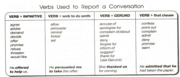 Reporting Dialogue or conversation Когда необходимо передать в косвенную речь диалогические высказывания или чьи-то разговоры, которые помимо всех повествований, вопросов и просьб также богаты и другими разговорными выражениями и conversational strategies, необходимо помнить, что в этом случае мы не передаем все диалогические выражения в механическом порядке так как они есть, а скорее нашей главной задачей встает передать общую суть, смысл разговора. Мы переводим значение высказывания при помощи подходящих по смыслу глаголов, таких как: complain, agree, confess, add, explain, exclaim, express, think, accuse, grumble etc.