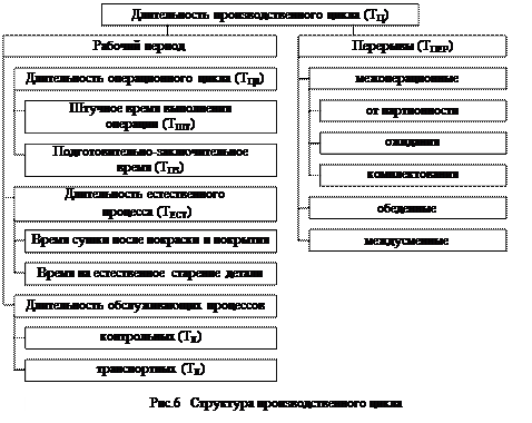 При организации производственного процесса предусматривается оптимальное сочетание в пространстве и во времени основного, вспомогательного и обслуживающих процессов. Главной целью осуществления производственного процесса является обеспечение минимального времени его выполнения, высокое качество и эффективность производства продукции. С этой точки зрения важнейшими характеристиками производственного процесса является длительность производственного цикла изготовления входящих в изделие деталей, узлов, Тц изделия в целом. Длительность производственного цикла - это отрезок времени от начала изготовления детали (узла) до ее готовности. От длительности производственного цикла зависят показатели работы производственных подразделений. В частности, чем меньше длительность производственного цикла изготовления детали (узла), тем: 1. большее количество продукции можно выпустить в единицу времени. 2. выше коэффициент использования основных производственных фондов (оборудования, инструмента, оснастки). 3. меньше объем незавершенного производства и, соответственно, объем оборотных средств (сырье, материалы, топливо, энергия и т.д.). Структура производственного цикла отображена на рис. 6.