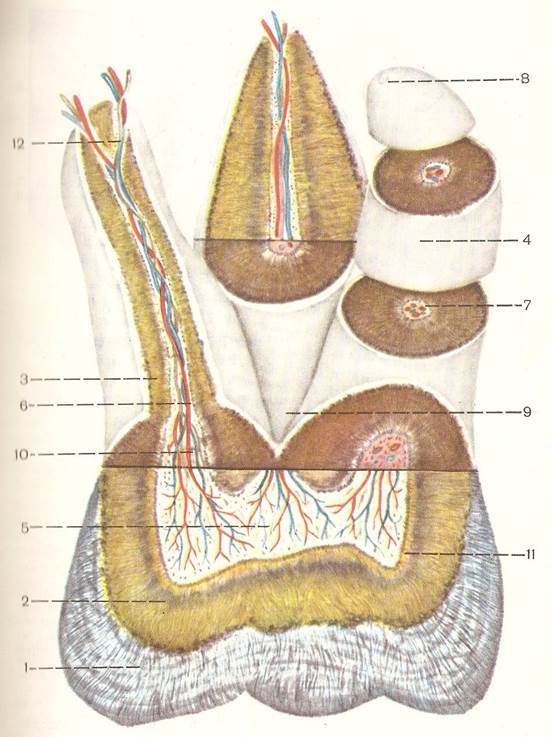 1 – эмаль; 2 – дентин; 3 – цемент; 4 – корень зуба; 5 – коронковая пульпа; 6 – сосудисто-нервный пучок; 7 – корневая пульпа; 8 – верхушка корня зуба; 9 – место схождения корней; 10 – устье корневого канала; 11 – рог пульпы; 12 – отверстие верхушки корня зуба.