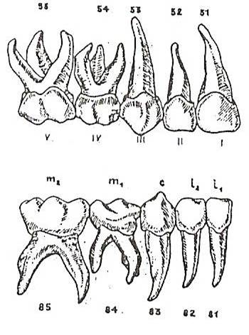В каждой половине зубных рядов имеется: Резца; Клык; Моляра (премоляры отсутствуют).