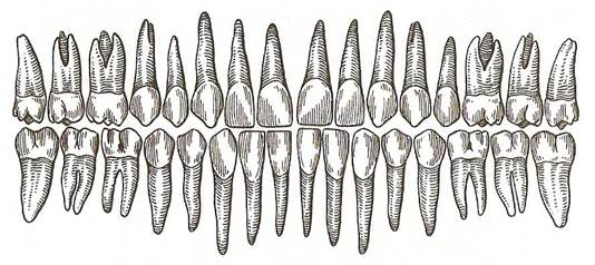 Всего при полных зубных рядах у взрослого человека имеется: Резцов; Клыка; Малых коренных зубов (премоляров); Больших коренных зубов (моляров).