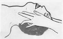 В ситуации, когда у пациента отсутствует сознание, прекратились дыхание и пульсация сонной артерии (устанавливается путем надавливания указательным и средним пальцами на сонную артерию глубоко в ямке сбоку от щитовидного хряща), необходимо провести тройной прием Сафара: запрокинуть голову назад, выдвинуть вперед нижнюю челюсть, открыть рот. Для этого необходимо выполнить следующие действия. 1. Уложить пациента на твердую плоскую поверхность, на спину. Если пациент лежит лицом вниз, нужно осторожно повернуть его на спи- ну таким образом, чтобы при повороте головы, плечи и туловище составляли единое целое. 2. Подложить под лопатки валик (одежда, подушка, одеяло и др.), чтобы голова слегка запрокинулась назад. 3. Голову максимально запрокинуть назад, а нижнюю челюсть выдвинуть вперед так, чтобы зубы располагались впереди зубов верхней челюсти (рис.1). Это приводит к смещению корня языка от стенки глотки и восстанавливает проходимость дыхательных путей, так как язык анатомически связан с нижней челюстью.