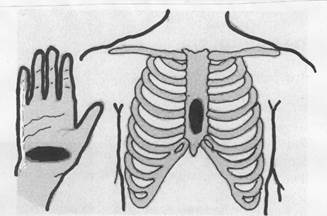 При отсутствии пульсации сонной артерии проводится механическая стимуляция сердца – непрямой (закрытый) массаж, который может осуществляться любым спасателем в отсутствие врача. Проведение наружного (закрытого) массажа сердца основано на том, что проводящий миокард обладает свойствами водителя ритма и если проводящая система и сократительный миокард не подверглись длительной гипоксии и в них имеется запас АТФ, то они сохраняют способность функционировать. Поэтому, если при внезапной остановке сердца (внезапная коронарная смерть, асистолия, фибрилляция желудочков) немедленно провести механический массаж сердца или электроимпульсную стимуляцию, оно способно в течение нескольких секунд вернуться к нормальной деятельности. Механическое сжимание сердца между грудиной и позвоночником приводит к изгнанию крови из сердца, что позволяет поддержать системное и легочное кровообращение. Больной при непрямом массаже сердца должен находиться на жесткой твердой горизонтальной поверхности. Если он находится на кровати, то под спину ему надо подложить щит или под сетку кровати подставить табуретку, чтобы грудной отдел позвоночника был на твердой поверхности. Перед началом компрессии грудной клетки следует нанести прекардиальный удар в область сердца путем сильного удара кулаком с расстояния 30 см в область нижней трети грудины. На фоне вагусной асистолии этого бывает достаточно, чтобы сердце снова стало сокращаться. Затем проводятся ритмичные надавливания на грудную клетку в области нижней части грудины спереди назад с целью сдавливания сердца между грудиной и позвоночником. Сердце при этом сдавливается настолько, что кровь из его желудочков полностью выходит в аорту и легочную артерию. После прекращения сдавливания грудная клетка расправляется, полости сердца восстанавливают прежний объем (функция тоничности) и они вновь наполняются кровью. Такие, искусственно вызванные сокращения сердца, как насосом обеспечивают непрерывный кровоток с доставкой кислорода к жизненно важным органам. Эффективность непрямого массажа сердца зависит от правильного выбора места приложения силы для сдавливания сердца и положения рук проводящего массаж. Таким местом является нижняя половина грудины над мечевидным отростком. При этом нижний край ладони должен быть на 2-2, 5см выше мечевидного отростка (рис. 5).