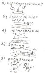 2. Пересеченная схема - коллекторы бассейнов канализования трассируются перпендикулярно направлению течения воды в водоеме и перехватываются главным коллектором, трассируемым параллельно реке. Такую схему применяют при плавном падении рельефа местности к водоему и необходимости очистки сточных вод. 3. Параллельная (веерная) схема - коллекторы бассейнов канализования трассируются параллельно или под небольшим углом к направлению течения воды в водоеме и перехватываются главным коллектором, транспортирующим сточные воды к очистным сооружениям перпендикулярно направлению течения воды в водоеме. Эту схему применяют при резком падении рельефа местности к водоему, так как она позволяет исключить в коллекторах бассейнов канализования повышенные скорости движения. 4. Зонная (поясная) схема - канализируемая территория разбивается на две зоны: с верхней сточные воды отводятся к очистным сооружениям самотеком, а с нижней они перекачиваются насосной станцией. Каждая из зон имеет схему, аналогичную пересеченной схеме. Зонную схему применяют при значительном или неравномерном падении рельефа местности к водоему и отсутствии возможности канализования всей территории самотеком. 5. Радиальная схема - очистка сточных вод осуществляется на двух или большем числе очистных станций. При этой схеме сточные воды отводятся с канализуемой территории децентрализованно. Такую схему применяют при сложном рельефе местности и канализовании больших городов. На схеме канализационной сети не указывают все колодцы, но обязательно указывают расчетные точки, в которых изменяются расходы, уклоны и диаметры труб. На второй стадии проектирования - выполнении рабочих чертежей - составляют планы канализационных сетей в масштабе 1: 500. На них наносят все смотровые колодцы, расположение которых уточняется засечками от углов зданий или иных закрепленных точек. Канализационные линии необходимо прокладывать прямолинейно; в местах поворотов сети, в местах изменения уклона линии и диаметра труб, а также в местах соединения нескольких линий необходимо устраивать колодцы. Повороты линии и присоединения следует выполнять под углом, равным или меньшим 90°.