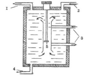 Рис. 2.6. - Спрощена схема метантенка: 1 – збір газа, 2 – свіжий осад 3 – гаряча вода, 4 – зброджений осад, 5 – змішувач