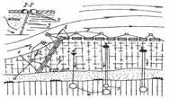 Рис. 2. Шугоотбойная запань на водозаборе Омска (р. Иртыш): 1 – запань; 2 – стальные трубы; 3 – деревянные погружные щиты; 4 – водоприемные оголовки; 5 – береговой колодец; 6 – насосные станции; 7 – фиксирующие железобетонные якоря; 8 – тросы крепления Электрообогрев решеток применяются на береговых водозаборах для предотвращения обмерзания и закупорки решетки внутриводным льдом. Строительство нескольких водоприемников усовершенствованного типа (комбинированный с фильтрующей частью), позволяет обеспечить надежный прием воды в достаточно сложных шуголедовых условиях.