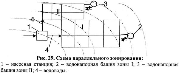Разделение системы водоснабжения на отдельные зоны называют зонированием системы водоснабжения, а сами системы – зонными. Зонирование системы водоснабжения устраивается при значительной разности отметок поверхности территории объекта и большой его протяженности, а также при большой разности свободных напоров, требуемых отдельными потребителями. Различают два основных типа зонных систем водоснабжения: параллельное и последовательное. При параллельном зонировании (рис. 29) зоны включаются параллельно и вода поступает в каждую зону отдельно по своим водоводам. На насосной станции для каждой зоны установлены отдельные группы насосов, отличающиеся по производительности и напору. При последовательном зонировании (рис. 30) зоны включаются последовательно. Вода в полном объеме сначала подается в нижнюю зону, часть ее транзитом проходит через нижнюю зону и далее отдельной группой насосов передается в верхнюю зону.