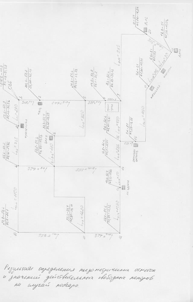 Вычисление пьезометрических отметок начинаем с наиболее удаленной точки встречи потоков, в которой величину действительного свободного напора Нсв.д принимаем равной требуемому Нсв.тр, т.е. Нсв.д = Нсв.тр. Величина Нсв.тр зависит от этажности зданий в населенном пункте и принимается равной 26 м (5 этажей). Для объектов водоснабжения железнодорожной станции и других предприятий величина Нсв.тр = 20 м, при пожаротушении Нсв.тр. = 10 м. Тогда пьезометрическая отметка в точке встречи потоков составит, м: Пд = Zз+Нсв.тр, где Zs - отметка поверхности земли в точке. Для определения пьезометрических отметок в остальных узлах сети необходимо к пьезометрической отметке в диктующей точке прибавить потери напора на участке от этой точки до рассматриваемого узла. При этом перемещаемся от узла к узлу в направлении против движения воды на участках. Величины действительных свободных напоров во всех узлах сети определяем по формуле, м: Нсв.д i = Пд i–Z3 i Если в процессе вычислений окажется, что в некоторых узлах Нсв.д < Нсв.тр, то следует увеличить все пьезометрические отметки и величину Нсв.д на наибольшую разницу DНсв = Нсв.тр-Нсв.д и исправления внести на схему. Результаты вычислений Нсв.д должны быть не меньше допустимых и не превышать 60 м. Для случая расчёта сети на пожарно-хозяйственный расход принимаем в наиболее удаленной точке сети Нсв.тр = 10 м и производим вычисление значений Нсв.д и Пд во всех узлах сети, учитывая при этом направление движения воды на участках. Если и в этом случае Нсв.д окажется в каком-либо узле меньше Нсв.тр = 10 м, то необходимо увеличить значения вычисленных пьезометрических отметок Пд и напоров Нсв.д на наибольшую разницу DНсв = 10 – Нсв.д Выполнив расчеты, строим продольный профиль (в нашем курсовом проекте на ЭВМ).