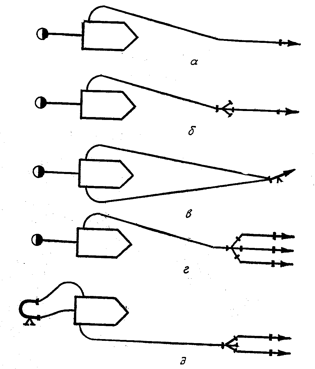 Рис. 3.1. Виды насосно-рукавных систем: а − простое соединение; б − последовательное соединение; в − параллельное соединение; г − смешанное соединение; д − гидроэлеваторная система Гидроэлеваторными системами можно забирать воду с глубин до 20 м или по горизонтали от гидроэлеватора до насоса на расстояние до 100 м.