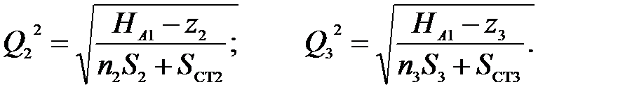 где S 1, S 2, , S 3 – сопротивление одного рукава соответственно в первой, второй и третьей линиях; n 1, n 2, n 3 – количество рукавов в линиях; S ст1, S ст2, S ст3 –сопротивление насадков стволов. Подставляя найденное значение Q (3.2) в характеристику насоса, находим максимальный напор Н н, который может создать насос, работая совместно с данной рукавной системой, то есть рабочая точка насоса будет задана параметрами Q н и Н н. Для определения требующегося напора насоса в зависимости от расхода воды (задача 2), необходимо располагать всеми параметрами конкретной рукавной системы. В этом случае напор насоса определяется по формуле Н н = h p + H cв + z 1 + z 2 + h вc, (3.6) где h p – потери напора в рукавной системе; H cв – свободный напор перед стволом; z 1 – высота подъема стволов над осью насоса; z 2 – высота всасывания; h вc – потери напора во всасывающей линии. В практических расчетах напор насоса определяется по формуле Н н = S с Q2 + z, (3.7) где S с – сопротивление рукавной линии, зависящее от вида рукавной системы; Q – расчетный расход воды; z – высота подъема пожарных стволов над осью насоса. Для примера рассмотрим решение этой задачи при использовании насосно-рукавной системы со смешанным соединением, показанной на рисунке 3.2. Система включает пожарный автонасос, установленный на пожарном гидранте, магистральную рукавную линию из n м стандартных рукавов диаметром d м сопротивлением S м одного рукава, трехходовое рукавное разветвление, расположенное на высоте zA по вертикали относительно оси насоса (потери насоса в разветвлении составляют h A), три рабочие рукавные линии с диаметром рукавов d p1, d p2, d p3 (сопротивление одного стандартного рукава S 1, S 2, S 3 соответственно) по n 1, n 2, n 3рукавов в каждой линии, и три пожарных ствола диаметром d ст1, d ст2, d ст3 с сопротивлениями S ст1, S ст2, S ст3, поднятыми на высоту z 1, z 2, z 3, по вертикали относительно рукавного разветвления.