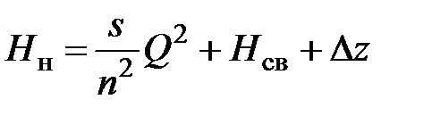 где s – сопротивление одного водовода (принимается, что материал, длина и диаметр всех водоводов одинаковы); n – количество водоводов; H св – свободный напор в конце водовода; ∆ z – разница геометрических отметок конца водовода (в месте подсоединения к сети) и оси насоса; Q – расчетный расход в безаварийной ситуации. Определим требуемый напор насоса при выходе из строя одного водовода: