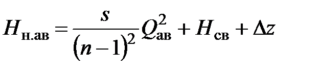 Для расчёта n по формуле (4.4) необходимо определить Q ав по формуле (4.1), s – по формуле s = Al. Значения Н св, ∆ z обычно заданы. Значение Н н.ав можно определить, рассматривая совместную работу насоса и водоводов (рис. 4.1). Из рисунка 4.1 следует, что значению расхода Q ав соответствует напор насоса Н н.ав.