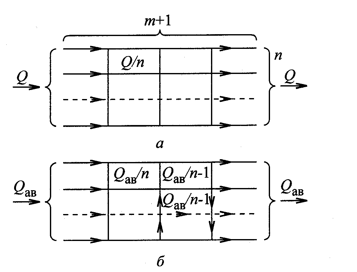 Рис. 4.3. Параллельная работа водоводов с перемычками: а − в безаварийном состоянии; б − при выходе из строя участка водовода; n − количество водоводов; m − количество перемычек Общее число участков – n (m + 1). Требуемый напор насосов при исправном состоянии системы равен: