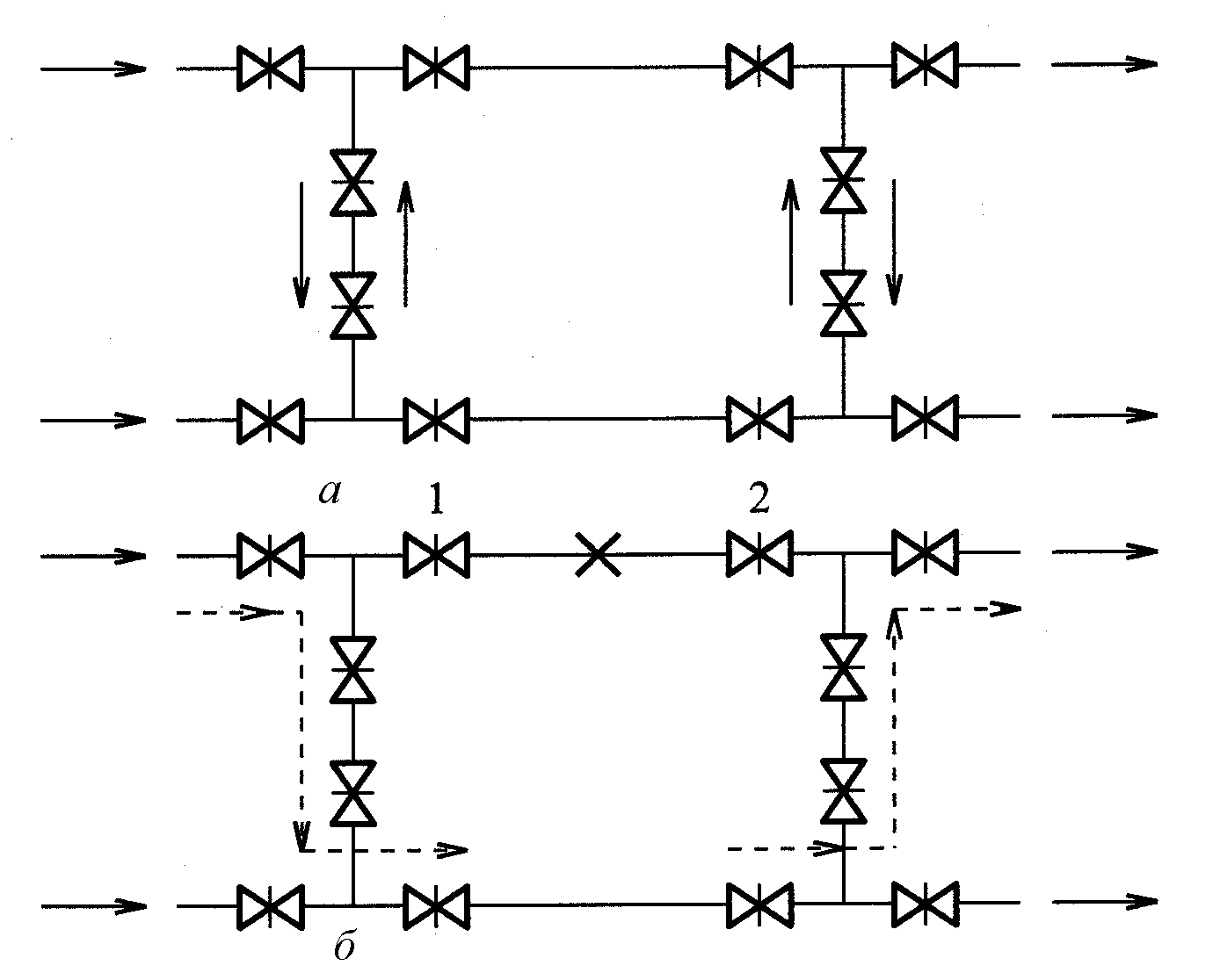 Рис. 4.4. Движение воды по водоводам и в перемычках: а – в исправном состоянии; б – при выходе из строя одного участка водовода