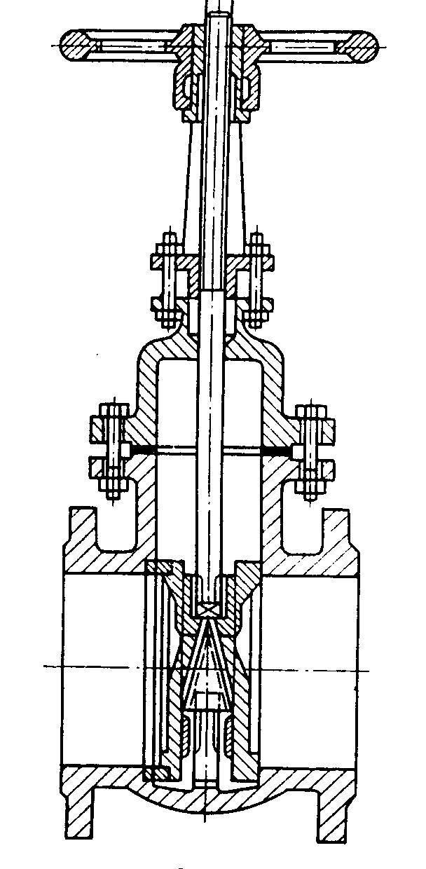 Рис. 4.7. Задвижка Вантузы служат для автоматического впуска и выпуска воздуха из трубопроводов. Вантузы устанавливаются на трубопроводах диаметром 400 мм и более на возвышенных точках профиля на расстоянии 250 м друг от друга. Если воздух не будет удален из трубопровода, то образуются воздушные подушки, уменьшающие площадь живого сечения трубопровода. Вантуз состоит из чугунного корпуса, в котором помещены пустотелые шары. Шары через кольца и шток жестко соединены с клапаном. При отсутствии воздуха шары под давлением воды снизу всплывают, клапаны плотно прилегают к своим седлам. При скоплении воздуха в верхней части вантуза вода отжимается, вместе с водой опускаются шары, плавающие в воде. Вместе с шарами опускаются клапаны и через образовавшиеся отверстия воздух выходит наружу.