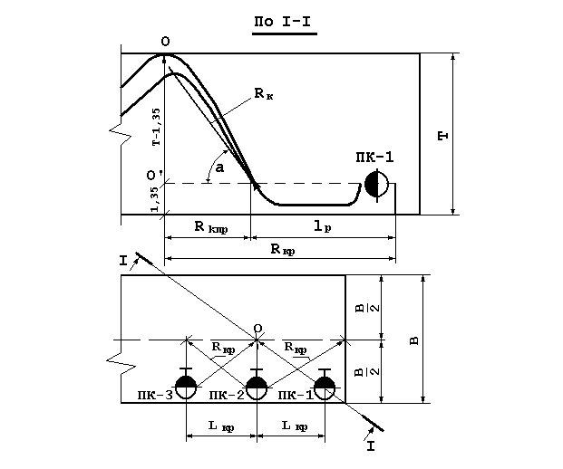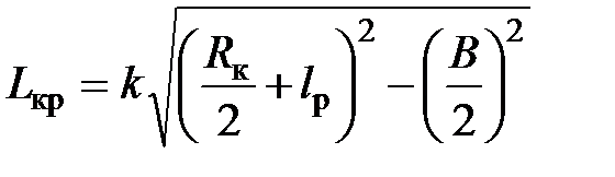 где L кр – расстояние между пожарными кранами; k – коэффициент, учитывающий условия орошения и принимаемый равным: к = 1 – при орошении каждой точки помещения двумя струями; к = 2 – при орошении каждой точки помещения одной струей; Rk – радиус действия компактной части струи; l p – длина пожарного рукава; B – ширина здания; T – высота помещения; 1, 35 – высота расположения пожарного ствола.