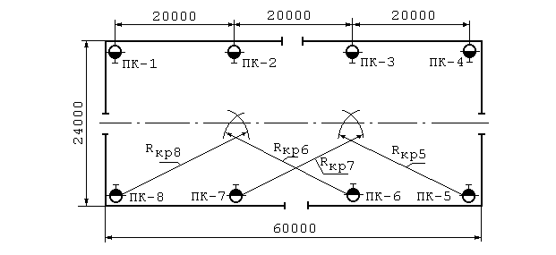 Рис. 6.11. Размещение пожарных кранов из условия орошения каждой точки помещения двумя струями 4. Составим аксонометрическую схему водопроводной сети (рис. 6.12), наметив на ней расчетные участки. Как видно, за расчетное направление следует принять направление от точки 0 до ПК-16 (расчёт проводится при отключении второго ввода).