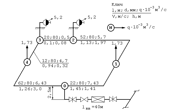 Принимаем трубы стальные диаметром 80 мм для магистральной сети и трубы чугунные диаметром 100 мм для вводов. 8. Производим расчет кольцевой магистральной сети. Потери напора определяем по формуле