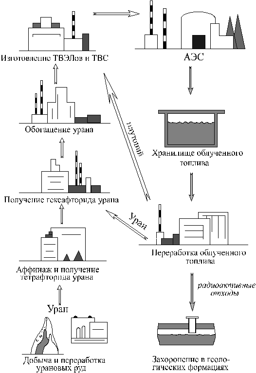 Рис.7. Схема цикла получения ядерного топлива, переработки и захоронения радиоактивных отходов Атомная станция (АС) - это электростанция, на которой ядерная (атомная) энергия преобразуется в тепловую, а затем и в электрическую. На АС тепло, выделяющееся в ядерном реакторе, используется для получения водяного пара, вращающего турбогенератор (АЭС), и частично для подогрева теплоносителя (АСТ, АТЭЦ). АС включают: один или несколько ядерных энергетических реакторов (паропроизводящие установки - главная особенность АС), паровые турбины, системы трубопроводов, конденсаторы, системы вывода генерируемой мощности и тепла, ряд вспомогательных цехов, установок и производств. В зависимости от используемого топлива, типа ядерной реакции и способа снятия тепла в мире разработано 7 основных типов ядерных энергетических реакторов. В странах СНГ АС имеют 4 типа реакторов: - реакторы кипящего типа (ВВЭР-440) на тепловых нейтронах с двухконтурным охлаждением реактора и съемом тепла водой; - реакторы с водой под давлением (ВВЭР-1000); - реакторы на быстрых нейтронах с охлаждением жидким натрием или магнием (БН); - графитовые реакторы кипящего типа (РБМК). С точки зрения безопасности предпочтение имеют легководные реакторы типа ВВЭР-440 и ВВЭР-1000, что объясняется наличием у них отрицательного коэффициента реактивности, проявляющегося в уменьшении нейтронного потока при увеличении температуры теплоносителя в активной зоне реактора, трехкратным резервированием всех активных систем, а также наличием противоаварийной оболочки. В реакторах типа РБМК проведено разделение функций теплоносителя (вода) и замедлителя нейтронов (графит). В результате появился положительный паровой эффект реактивности, который проявляется в увеличении нейтронного потока при повышении температуры воды и превращении ее в пар. В свою очередь это может привести к неконтролируемому разгону реактора при выходе из строя или отключении систем безопасности. Отработанное на АЭС топливо первоначально, перед отправкой на радиохимические заводы, хранится на территории АЭС в специальных бассейнах. Ввиду того, что ядерное топливо является высокоактивным, в нем продолжается процесс деления, а вода служит одновременно защитной и охлаждающей средой. После нескольких лет охлаждения в бассейнах ТВС пригодны для транспортировки и дальнейшей переработки. Основные причины аварий на атомных станциях: - низкий уровень технологической дисциплины оперативного персонала АС и его профессиональной подготовки;