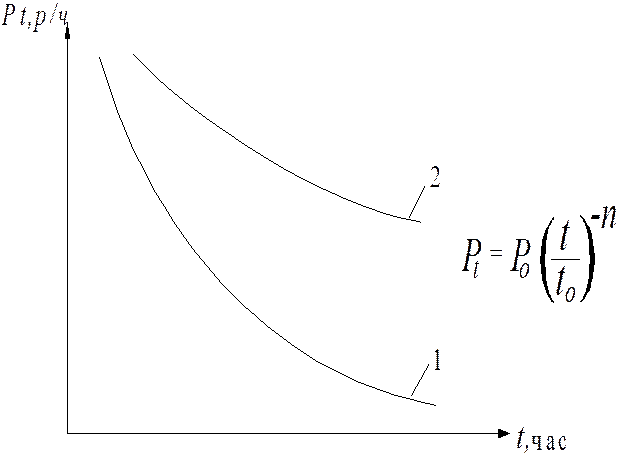 Рис.9. Зависимость изменения мощности дозы излучения на местности (Pt) во времени (t) после аварии: 1-для ядерного взрыва, 2-для аварии на АС (31)