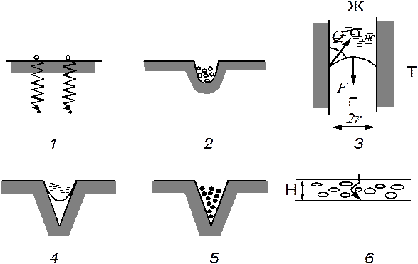 Рис. 14. Глубинные радиоактивные загрязнения в результате: 1 – диффузии; 2 - попадания мелких частиц в глубинные поверхности; 3 - капиллярного смачивания; 4 - капиллярной конденсации в порах; 5 - молекулярного заполнения пор; 6 - проникновения вглубь капиллярно-пористого тела