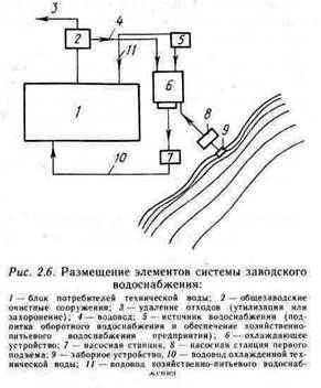 Системы водоснабжения представляют собой комплекс взаимосвязанных сооружений, предназначенных для обеспечения водой объектов промышленного водоснабжения. Производственное водоснабжение должно удовлетворять требованиям защиты природных источников от загрязнения. В состав системы водоснабжения в соответствии с ее назначением входят следующие сооружения: водозаборы, насосные станции, устройства для очистки и обработки внутри отдельных технологий и общезаводские очистные сооружения (реагентное и катионитное умягчение воды, опреснение, удаление железа и растворенных газов, фильтрация и очистка оборотной технической воды), водоводы и водопроводные сети, регулирующие и запасные емкости. В качестве примера на рис. дано расположение основных систем оборотного водоснабжения промышленного предприятия, использующего два природных источника водоснабжения. Крупные заводы являются характерными объектами водоснабжения, где могут устраиваться как раздельные, так и объединенные системы для подачи воды на производственные и хозяйственно-питьевые нужды, причем объединенная система возможна в тех случаях, когда к качеству производственной воды предъявляют те же требования, что и к питьевой (предприятия пищевой промышленности). Во всех остальных случаях устраиваются раздельные системы производственного и хозяйственно-питьевого водоснабжения. По кратности использования технической воды системы водоснабжения разделяются на прямоточные и оборотные Прямоточные схемы водоснабжения промышленных предприятий (даже при наличии эффективно работающих очистных сооружении) теперь не используются вследствие возможного загрязнения природных источников водоснабжения и больших расходов воды