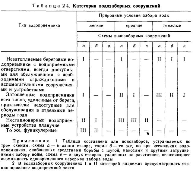 В табл. 2.3 приведены рекомендации по применению водозаборных сооружений различных типов. В табл. 2.4 приведены категории водозаборных сооружений (QB = 1...6 м3/с) в зависимости от характеристики природных условий забора воды, типа водоприемника и принятой схемы водозаборных сооружений. По этой таблице проверяют, соответствует ли заданной категории обеспеченности подачи воды принятая схема водозаборных сооружений. Повышение категории водозаборов с затопленными водоприемниками на единицу допускается в случаях размещения водоприемника в затопляемом самопромывающемся водоприемном ковше, подвода к водоприемным отверстиям теплой воды (не менее 20 % забираемого расхода воды) и применения специальных наносозащитных устройств, обеспечения надежной системы промыва самотечных водоводов, сороудерживающих решеток и рыбозащитных устройств (РЗУ) водоприемников.
