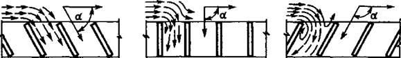 Рис 2 8 Схемы втекания воды в водоприемные отверстия, оборудованные решетками: а — при α < 90°; б — при α = 90°, в — при α ≈ 135°