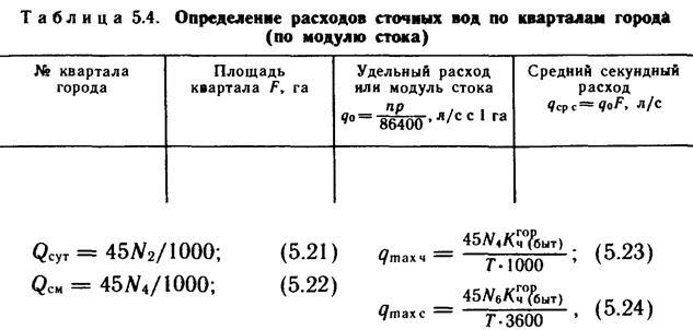Определение средних расходов сточных вод по кварталам города выполняют по расчетной численности населения N (табл. 5.3) либо по модулю стока qa (табл. 5.4). • Расчетные расходы бытовых сточных вод от промышленных предприятий определяют по формулам: