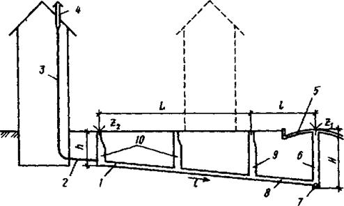 Варианты трассировки (рис. 7.1, а, г, д, ж) характерны для условий, когда максимальное заглубление главного коллектора сравнительно невелико (до 8 м) и его прокладка осуществляется в сухих или слабообводненных грунтах. Если участок главного коллектора от начальной точки до главной насосной станции называется плечом, то такие главные коллекторы являются одноплечими. Подобные варианты наиболее экономичны в тех случаях, когда город имеет небольшую протяженность вдоль реки, основные расходы сточных вод от уличных коллекторов сосредоточены в начальной части главного коллектора, а уклон местности совпадает с его направлением и способствует минимальным заглублениям. Рассмотренные варианты трассировки могут быть дополнены решением, когда главные насосные станции удается располагать в пределах очистных станций, что упрощает их эксплуатацию. Дополнительным преимуществом данного решения является возможность применения шнековых водоподъемников, что позволяет экономить электроэнергию и избегать трудностей, связанных с эксплуатацией решеток. Варианты трассировки (рис. 7.1, 6, в, е, з) целесообразны в тех случаях, когда город имеет большую протяженность вдоль реки, а сравнительно высокий уровень грунтовых вод затрудняет прокладку коллектора глубокого заложения. Использование при этом трассировки с одноплечими главными коллекторами вызывает необходимость устройства промежуточных станций подкачки, что увеличивает эксплуатационные затраты и снижает надежность работы системы водоотведения в целом. Если часть самотечного главного коллектора трассируется к главной насосной станции в направлении, совпадающем с течением реки, а другая часть — в направлении, противоположном течению реки, то такие главные коллекторы являются двуплечими. Экономический анализ показывает, что подобная трассировка позволяет уменьшить заглубление сети, избежать устройства промежуточных насосных станций подкачки, а также уменьшить диаметры главных коллекторов за счет сокращения транзитных расходов сточных вод. Некоторое увеличение протяженности напорных трубопроводов, а также неудобства от расположения главной насосной станции в черте городской застройки с избытком окупаются при использовании данного способа трассировки. Варианты трассировки (рис. 7.1, в, г, ж, з) характерны для городов, имеющих двускатный рельеф местности относительно речной долины. Районные насосные станции, обслуживающие районы города на обратном скате местности, в свою очередь могут располагаться в конце районного одноплечего коллектора или в промежуточной части двуплечего коллектора. В обоих случаях сточные воды от районной насосной станции по напорным водоводам через камеру гашения напора поступают в самотечный уличный коллектор и по нему — к главной насосной станции.