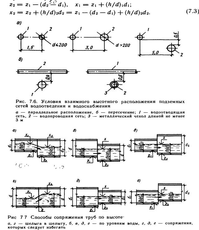 При малых расходах в начальных участках сети, особенно при плоском или слабовыражениом рельефе местности, обычно не удается обеспечить самоочищающие условия ввиду низких наполнений труб. Такие участки сети, прокладываемые с минимальными уклонами, принято считать безрасчетными. Условия взаимного высотного расположения сетей водоотведения и водоснабжения представлены на рис. 7.6. В практике проектирования используют два метода сопряжения труб по высоте в узловых смотровых колодцах: «шелыга в шелыгу» и «по уровням воды» (рис. 7.7). Известными величинами при решении данных задач являются диаметры труб d\, d2, м, наполнения (h/d)\, (h/d)2, отметка лотка подводящего трубопровода z\, м. Определению подлежат отметка лотка отводящего трубопровода Z2, м, отметки сопрягаемых уровней воды X, Х\, Х2, м. При соединении трубопроводов способом «шелыга в шелыгу» (по верхней части труб) (рис. 7.7, а) искомые величины находят следующим образом: