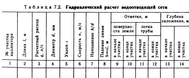 Таким образом, высотное сопряжение труб одинакового диаметра, но разного наполнения способом «по уровню жидкости», во избежание подпора является обязательным. Из двух методов соединения труб разного диаметра предпочтителен способ «по уровням воды», при котором заглубление коллектора получается меньшим. Результаты гидравлических расчетов и высотного проектирования главного коллектора сводят в табл. 7.2.