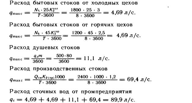 Таким образом, расходы сточных вод, л/с от I, II н III районов города — 569, 1, 637, 3; 437 соответственно, что в целом по городу составляет 1643, 4 л/с. Переходя к определению расхода сточных вод от промышленного предприятия, в соответствии с исходными данными вычислим количество работающих в максимальную смену в холодных цехах: 3000-0, 6 = 1800 человек. Тогда в горячих цехах в максимальную смену работает 3000 — 1800 = 1200 человек.