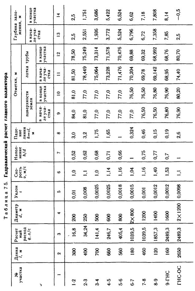 Определяем площади стока, тяготеющие к отдельным участи кам сети и обозначенные индексами а, б, в, г, д. Общий средний! расход для каждого участка складывается из транзитного, попут-j ного и бокового расходов. При этом общий средний расход от данного участка сети является транзитным для соседнего нижележащего участка. В табл. 7.4 приводятся результаты определения расходов сточных вод для участков сети. Каждый участок се-{ ти должен быть рассчитан на пропуск сточных вод, поступающих) по его длине, а также от вышележащих участков. При расчете принимают, что путевой расход поступает в начальной точке каждого участка — это создает дополнительный резерв пропускной способности главного коллектора. Коэффициент неравномерности Кобщ (графа 7) определяют методом интерполяции по табл. 5.2 с учетом средних расходов. Проверкой правильности проведенных расчетов является равенство общего среднего расхода на участке ГНС-ОС (графа 6) и суммарного среднего расхода от города по табл. 7.4. • Профиль главного коллектора. Гидравлический расчет главного коллектора оформляют в виде табл. 7.5, графы 1, 2, 3, 9 н 10 которой заполняют на основании предшествующих расчетов и исходных данных. Минимальный диаметр водоотводящей сети 200 мм. Диаметры неметаллических труб, выпускаемых промышленностью от 200 до 400 мм, идут через 50 мм, от 500 до 600 мм — через 100 мм, от 600 мм до 1600 мм — через 200 мм, от 2000 до 2400 мм и более — через 400 мм, образуя следующий предпочтительный ряд диаметров: 200—250—300—350—400— 500—600—800— 1000— 1200— 1400— 1600— 1800—2000—2400 мм. В соответствии с этим выбор труб диаметром, например 550 мм, является ошибкой; не следует также в самотечных сетях использовать диаметры 700, 900 и 1100 мм, так как такие неметаллические трубы отечественная промышленность не выпускает. Гидравлический расчет главного коллектора выполняют с использованием сокращенных таблиц гидравлического расчета (см. Приложение 8), а при их недостаточности — с использованием «Таблиц для гидравлического расчета канализационных сетей и дюкеров по формуле акад. Н. Н. Павловского» А. А. Лукиных и Н. А. Лукиных или таблиц Н. Ф. Федорова. Участки главного коллектора 1-2 и 2-1 являются верховыми" со средним уклоном местности, близким к 0, 01. В этом случае уклоны трубопроводов назначают таким образом, чтобы начальное заглубление коллектора 2, 5 м изменялось незначительно. На остальных участках коллектора уклоны трубопроводов назначают близкими к минимальным при условии обеспечения в них самоочищающих скоростей и расчетных наполнений в соответствии с данными табл. 6.2. Сопряжение труб на всех расчетных участках коллектора выполняют по уровню жидкости. На примере точки 5 коллектора осуществим вертикальное сопряжение труб в колодце, т. е. при известной абсолютной отметке лотка подводящей трубы г\ определим отметку отводящей трубы: z2 = zi — [(h/d)2d2 - {h/d)1d1] = 71, 578 - (0, 66 • 0, 8 --0, 71 -0, 6) = 71, 476 м. При этом отметка сопряженного уровня жидкости х в точке 5 равна х = 71, 578 + 0, 71 • 0, 6 = 71, 476 + 0, 66 • 0, 8 = 72, 004 м. Требуется рассчитать дюкер (участок 6—7) на пропуск расхода 1039, 5 л/с. Принимаем две стальные нитки диаметром каждая 800 мм на пропуск 50 % общего расхода со скоростью не ниже 1 м/с при единичных потерях i = 0, 0015. Общие потери напора в дюкере h составят h = hтр + h„ = il + 0, 2hтр = 0, 0015 • 180 + 0, 2 • 0, 27 = = 0, 27 + 0, 054 = 0, 324 м. С учетом отметки лотка трубы в верхней камере 70, 204 и общих п