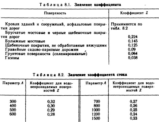 • Коэффициент стока. При выпадении дождя часть дождевого стока испаряется, часть просачивается в грунт или поглощается растениями. Это учитывается коэффициентом стока. Его значение зависит от многих факторов, в том числе от вида поверхностного покрова (водопроницаемость покрытия), интенсивности и продолжительности выпадения осадков. Средние значения коэффициента стока Zm< d определяют как средневзвешенную величину зависимости от коэффициентов Z, характеризующих поверхность (табл. 8.1).