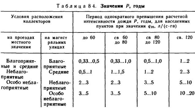 Период однократного превышения расчетной интенсивности — это время, в течение которого выпадает один дождь интенсивностью, большей расчетной и вызвавшей переполнение сети. Период однократного превышения расчетной интенсивности Р подбирают в зависимости от назначения объекта водоотведения, расположения коллектора в уличном проезде, климатических условий (интенсивности дождя), коэффициента стока и других факторов (табл. 8.4).
