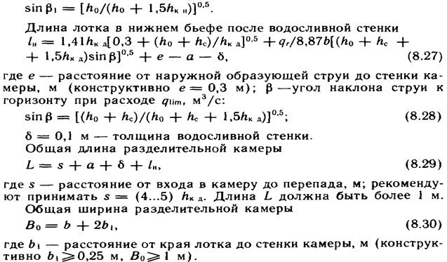 Возможны разные конструктивные решения разделительных камер (рис. 8.7). На рис 8.8 дождевая вода попадает в прямоугольный лоток, ширина которого принимается равной диаметру дождевой сети, примыкающей к камере. В конце прямоугольного лотка перед перепадом устанавливается критическая глубина, которая при расчетном расходе qr, м,